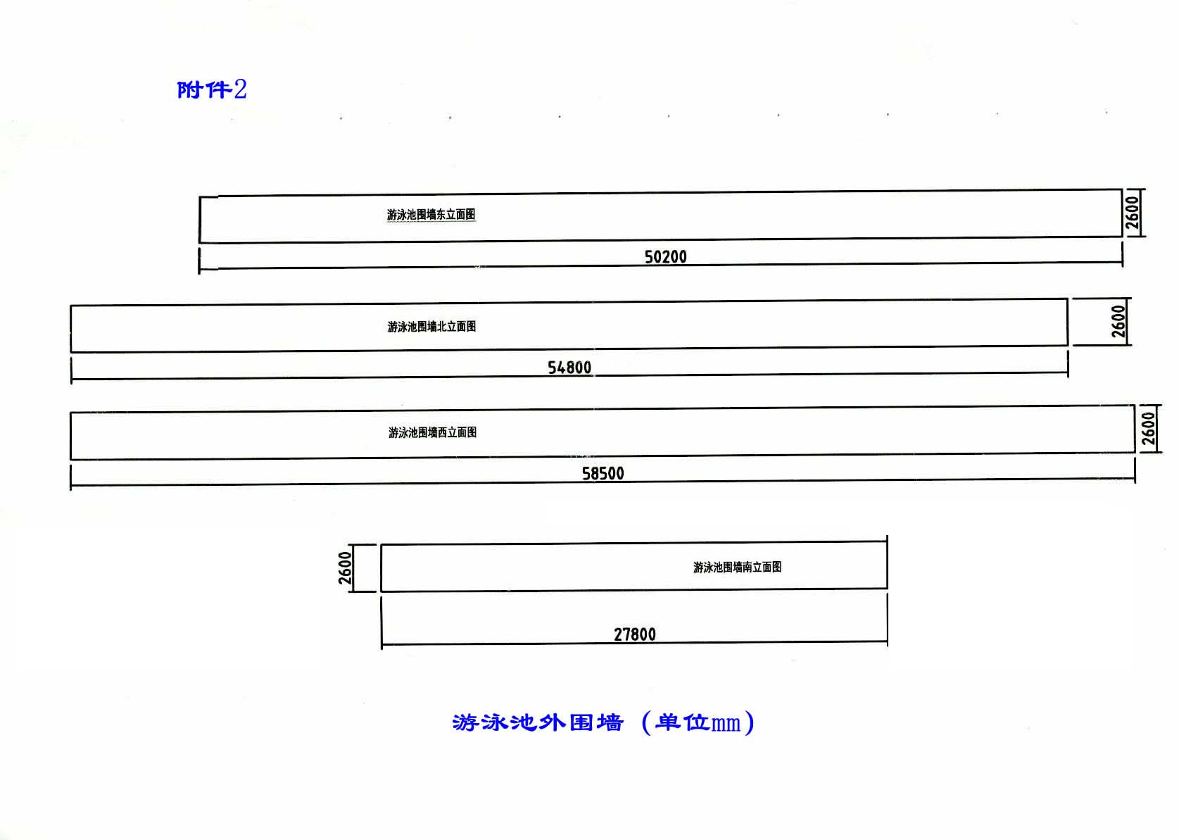 6、尺寸:游泳池外墙(见附件2);附属中学外墙(高2620mm、长35500mm);