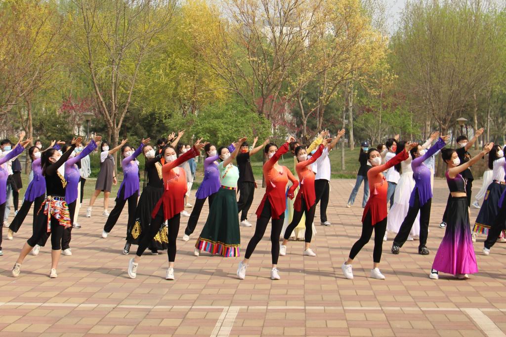在快闪活动现场,校领导热情地融入到学生当中,与大家共同唱响歌曲《经贸大学的阳光》。伴随音乐响起,校领导为同学们“打拍子”加油鼓劲,大家随着歌曲热情洋溢地舞蹈,美妙的旋律、优美的舞姿点燃了现场每一个人的激情,歌声回荡在学校上空。快闪现场也吸引了途经学生的驻足观看,火热的氛围感染带动他们与现场同学一齐歌舞起来。